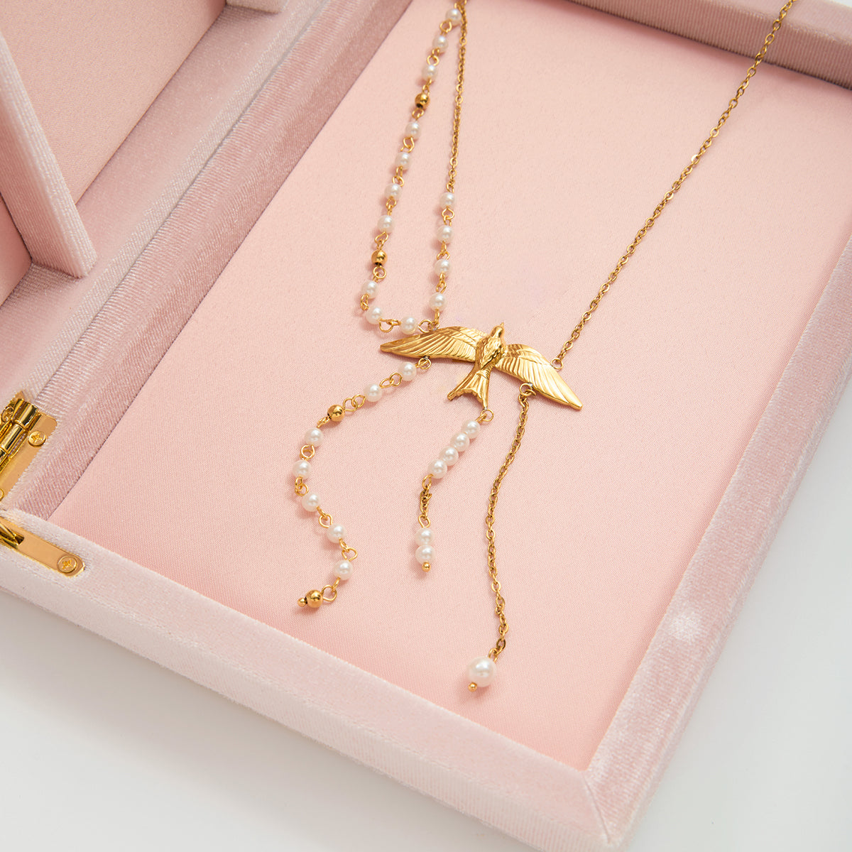 Collier en acier inoxydable plaqué or 18 carats en chaîne de chandail avec pendentif en forme d'oiseau hirondelle et perles de verre