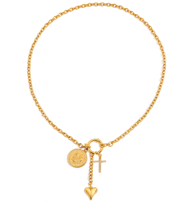 Collier en acier inoxydable avec strass et croix + pendentif en forme de coeur avec boucle de marin