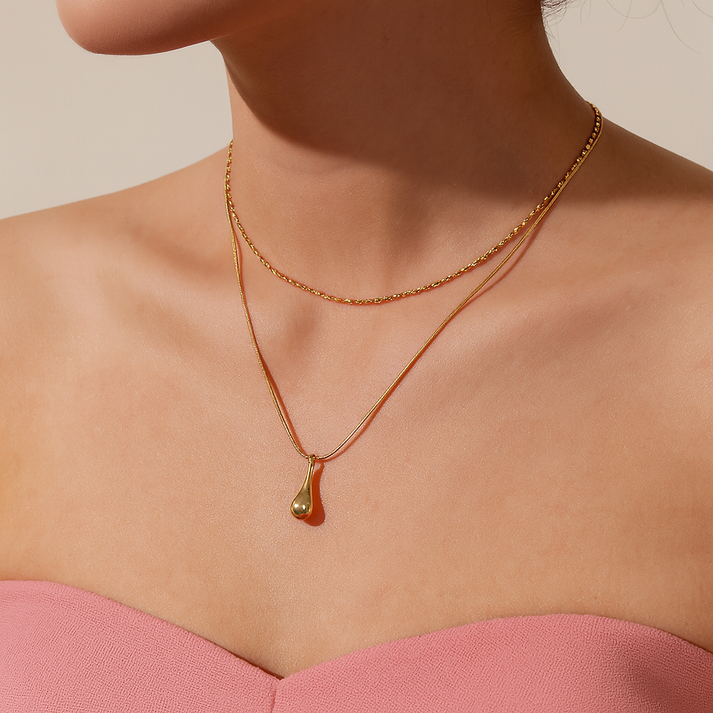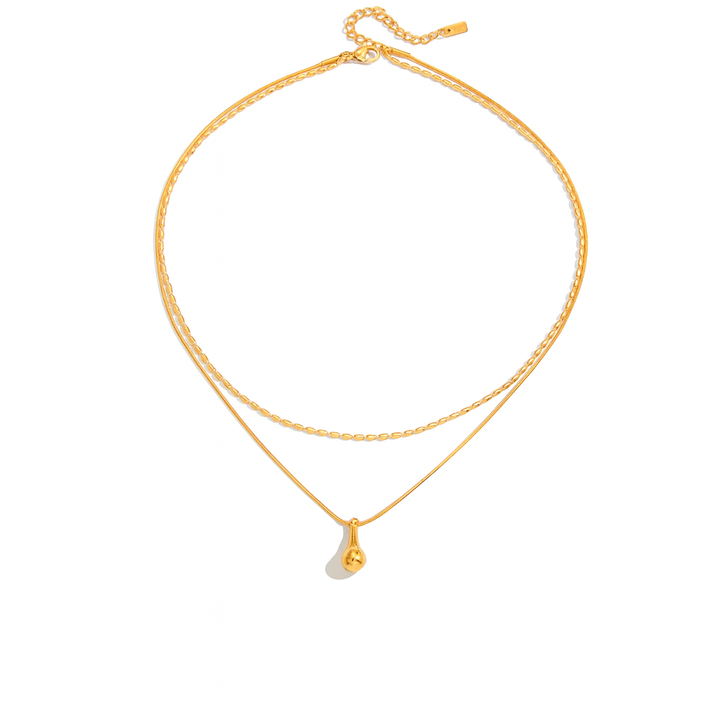 Collier en acier inoxydable plaqué or 18 carats double couche de perles ovales avec pendentif larme
