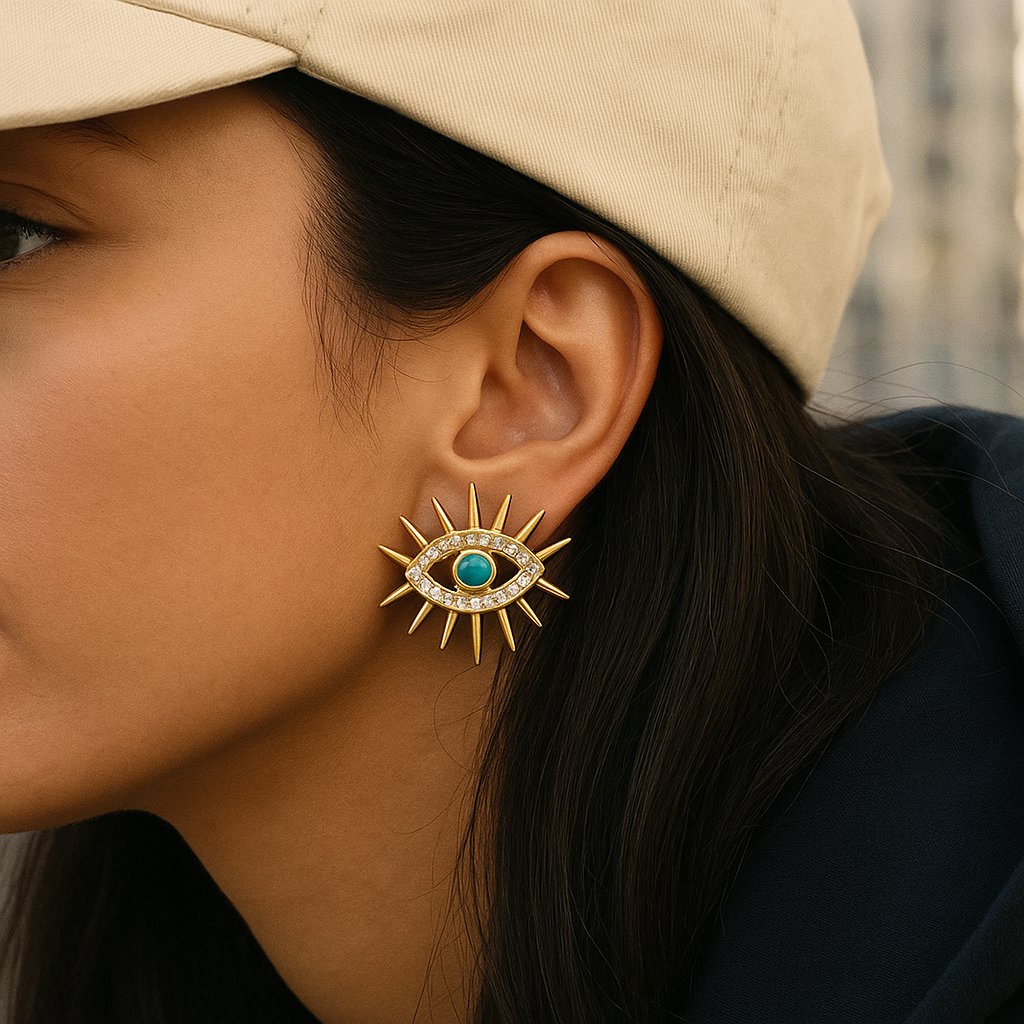 Boucles d'oreilles acier inoxydable plaqué or 18 carats, en zircon bleu turquoise blanc et œil de diable